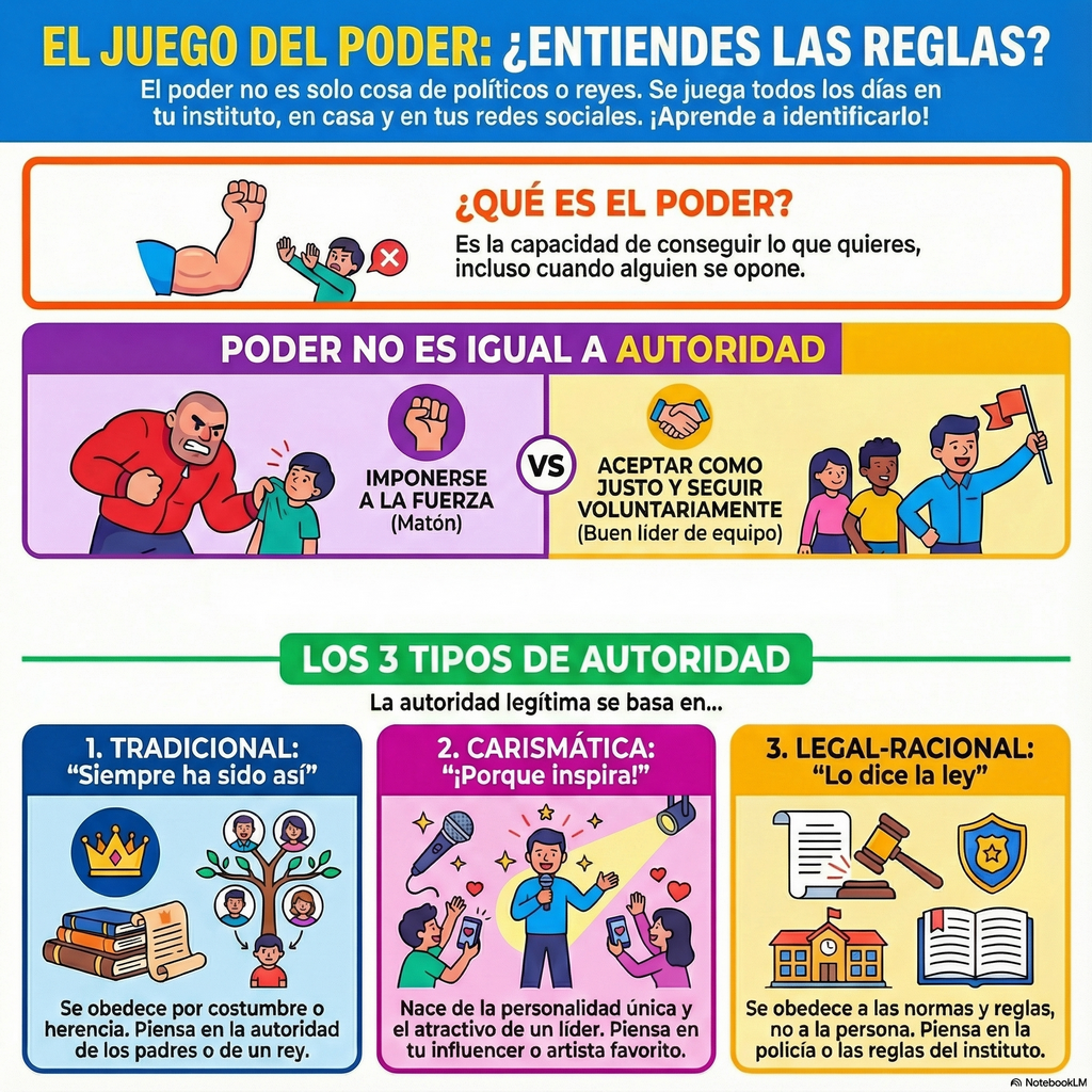 Este es un excelente tema para trabajar con adolescentes, ya que el poder es un fenómeno universal y fundamental en todas las relaciones humanas, lo que permite conectar los conceptos sociológicos con su vida cotidiana. Vamos a verlo en dos momentos diferentes. Gracias al grupo de jóvenes que me ha hecho reflexionar sobre el tema.